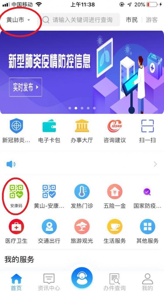 3,注册完成后,返回首页。右上角选择“黄山市”,而后点击“安康码”,进入安康码申领界面。
